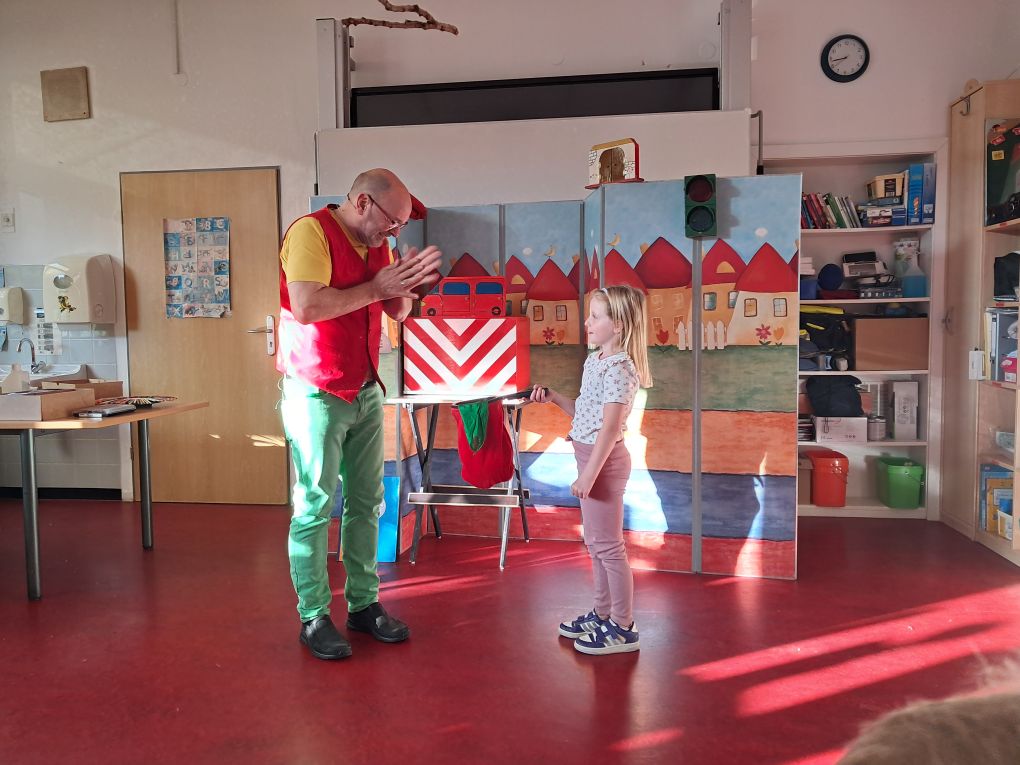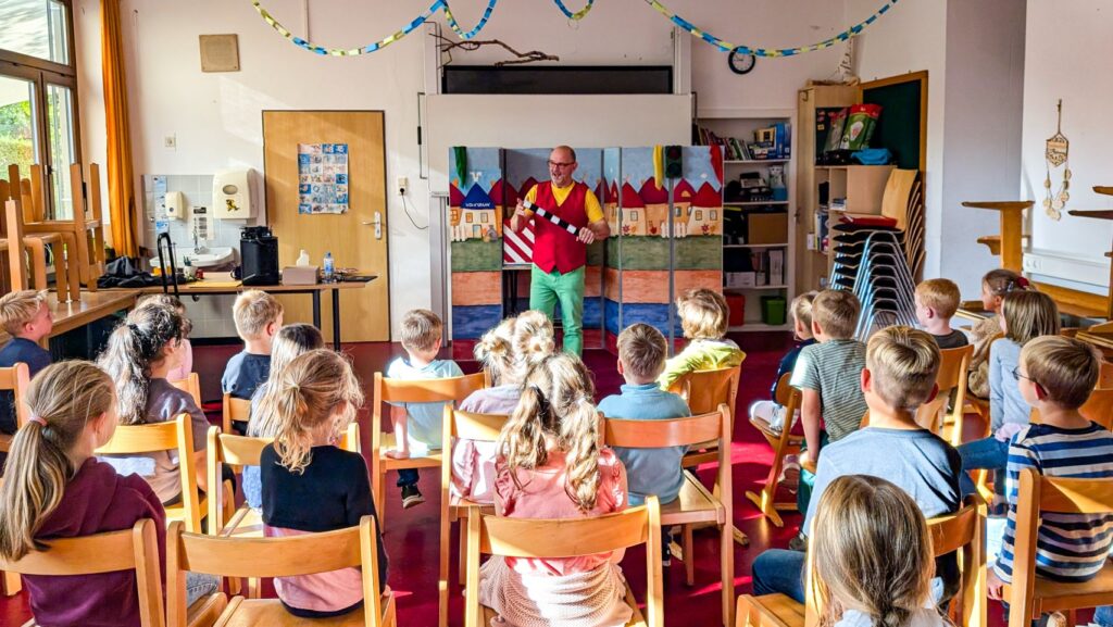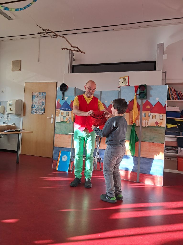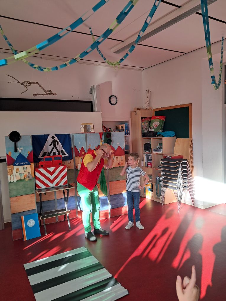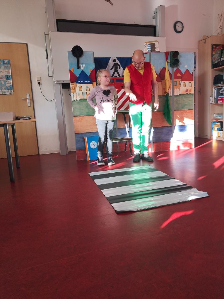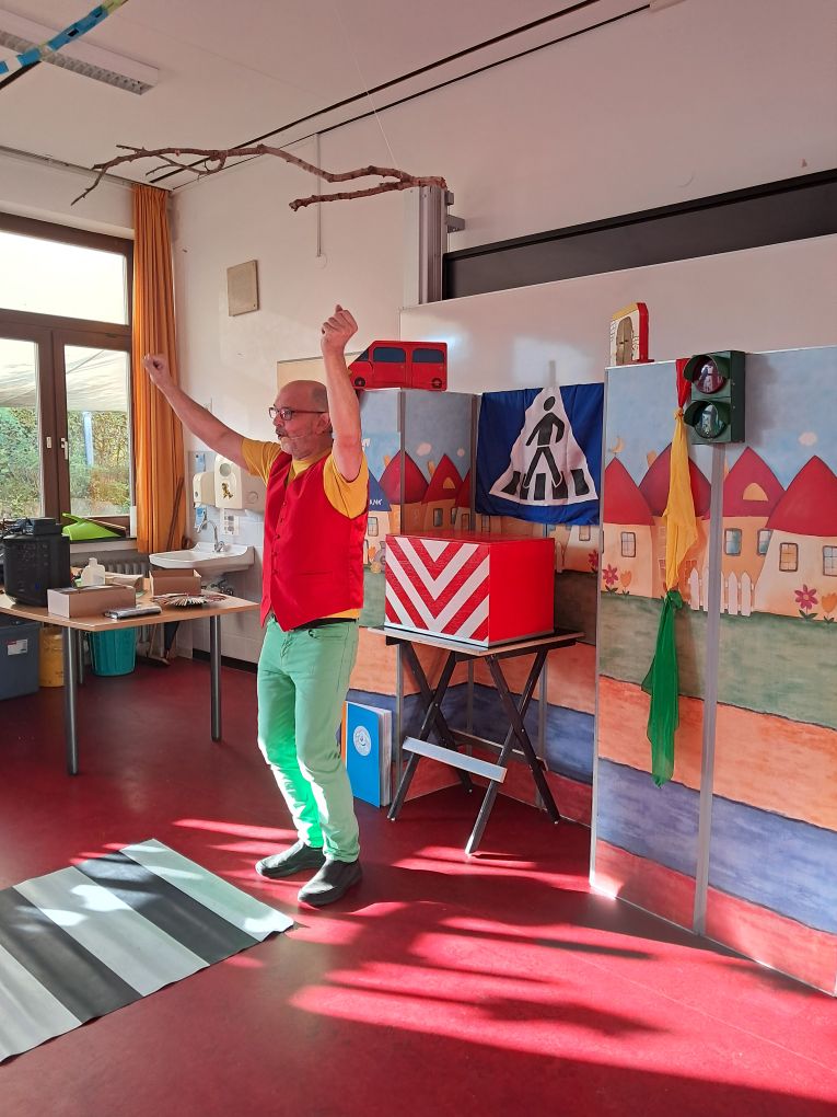 Mit einer Variation aus Mitmachtheater, Puppenspiel und Zauberei vermittelte der Verkehrszauberer unseren Schülerinnen und Schülern der Schuleingangsklassen Wissen über ein sicheres Verhalten als Fußgänger im Straßenverkehr.